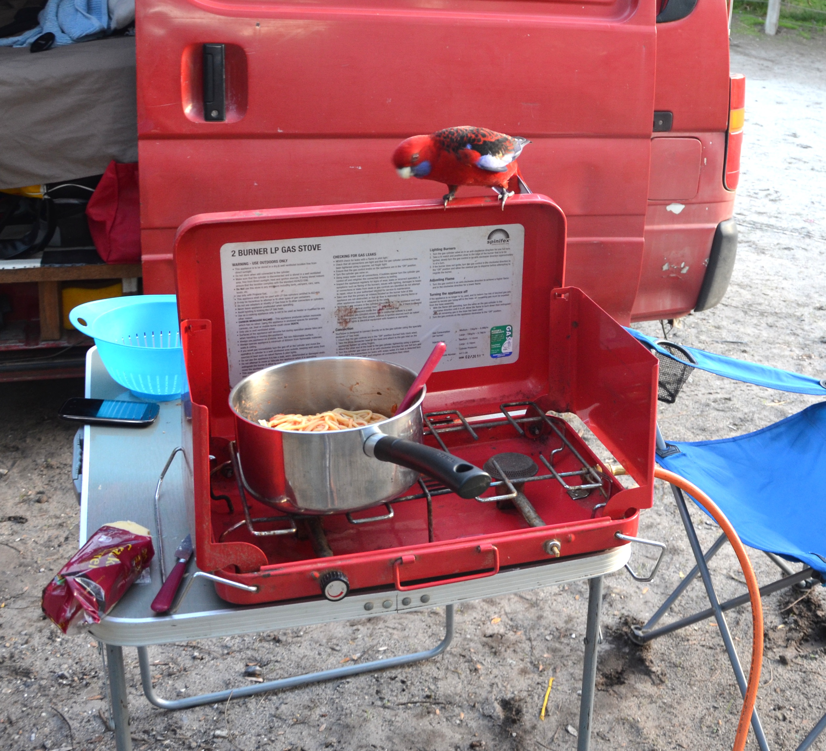 De retour à notre emplacement de « camping » et alors que nous nous préparions un magnifique repas (= des pâtes), une petite perruche multicolore commence à s’intéresser de très près à notre garde manger. Elle essaie de chiper notre pain de mie à l’intérieur même du coffre ! Nous commençons à lui donner quelques morceaux de mie et assez rapidement elle nous grimpe sur les bras. BIEN ENTENDU, nous attirons l’intégralité des enfants du camping dont nous sommes devenus les idoles (rien que ça). Ces enfants, sont arrivés à grand renfort de tranches entières de jambon (rien que ça BIS). Nous étions tous absolument fascinés par les oiseaux, et nous nous sommes beaucoup amusés. Mais, ensuite, et surement grâce à l’armée de 10-14ans, notre amie la perruche (Crimson Rosella de son vrai nom) a commencé à appeler toutes sa famille perruche et nous étions envahis d’oiseaux rouge, vert et bleu qui essayaient de chiper notre plat du soir. Elles essayaient clairement de nous abuser avec leurs couleurs chatoyantes et leurs petites têtes toutes mignonnes pour ensuite voler nos vivres !! PIRATES !